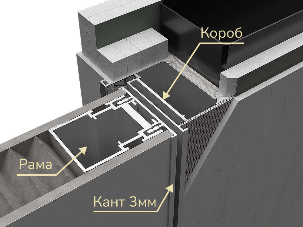 В нашем коробе скрытая петля не пробивает стену, что позволяет легко обслуживать или заменять петли