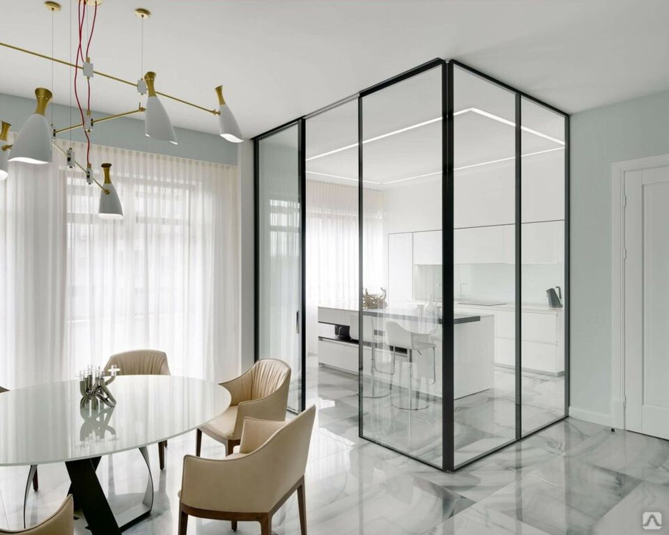 Статичные перегородки (без двери) – красивое зонирование пространства. Такие в квартире создают ощущение полноценного зонирования, при этом не уменьшая площадь и не лишая пространство естественного света. Единственный минус, это нет звукоизоляции, больше применяют в декоративном плане.