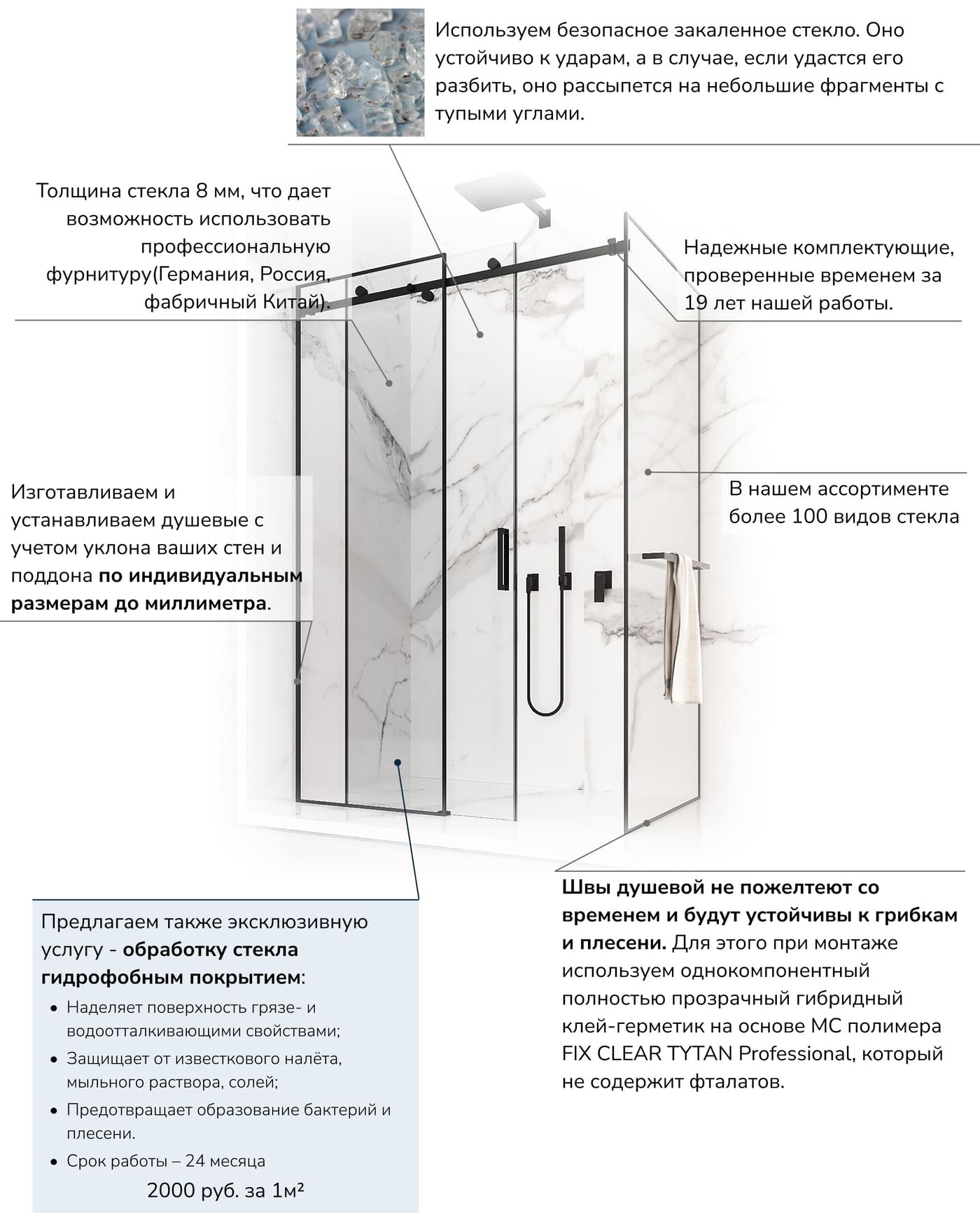 При монтаже используем профессиональный гибридный клей герметик FIX CLEAR TYTAN Professional, да он дороже обычного герметика в несколько раз. Это удорожание изделия. Но в последующем, швы у душевой перегородки не темнеют и не покрываются плесенью! Ваша душевая будет эстетично выглядеть долгое время!