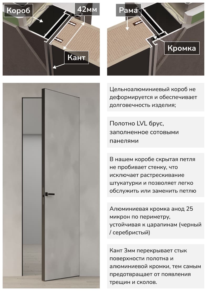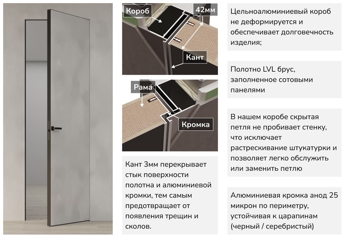 Если вы ищете двери скрытого монтажа под покраску, то у нас есть отличные предложения в самых разных ценовых категориях - от бюджета до премиум. Отличительная особенность всех наших дверей - цельноалюминиевый короб, который не подвержен деформации, поэтому может обеспечить двери более долгий срок службы. А в среднем ценовом сегменте и в премиум мы предлагаем двери не только с цельноалюминиевым коробом, но и с цельноалюминиевой рамой, которая обеспечивает полотну двери меньший вес и гораздо большую защиту от деформации, чем деревянная рама.