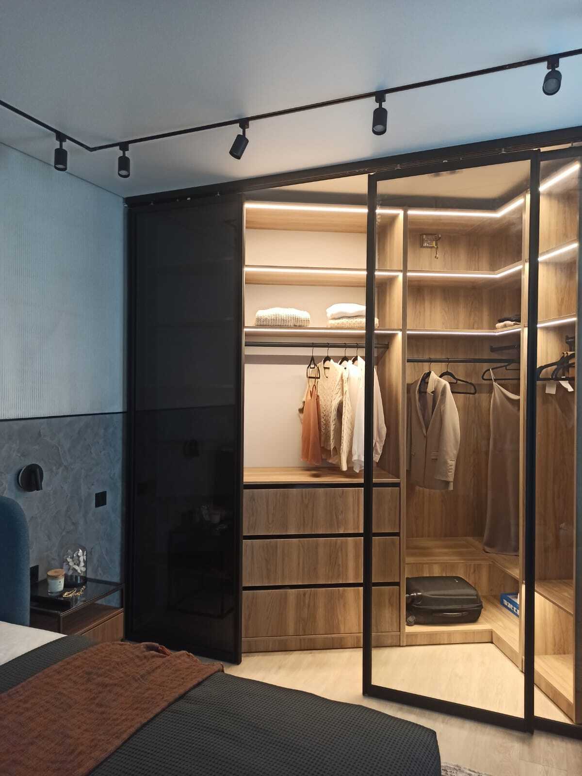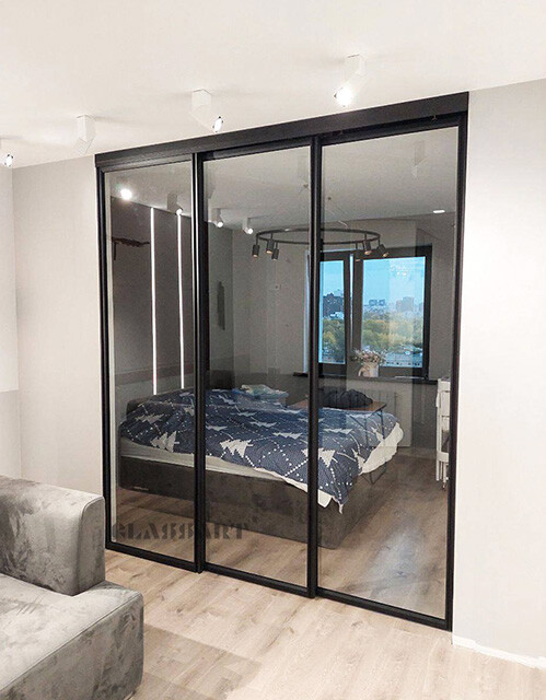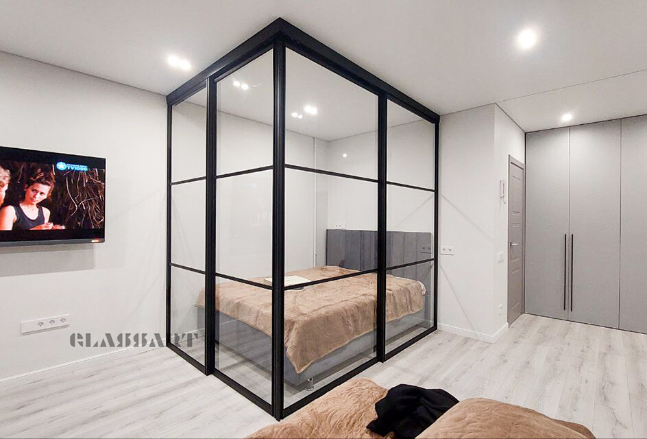 Угловая раздвижная межкомнатная перегородка для зонирования спальной зоны