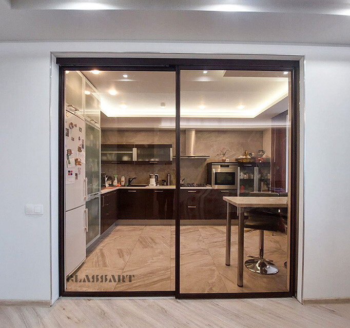 Выполнена на раздвижной беспороговой системой Росла (Roslа). Алюминиевый профиль Браво Траверс (Bravo Traverse) 35*40 - его форма служит удобной ручкой.