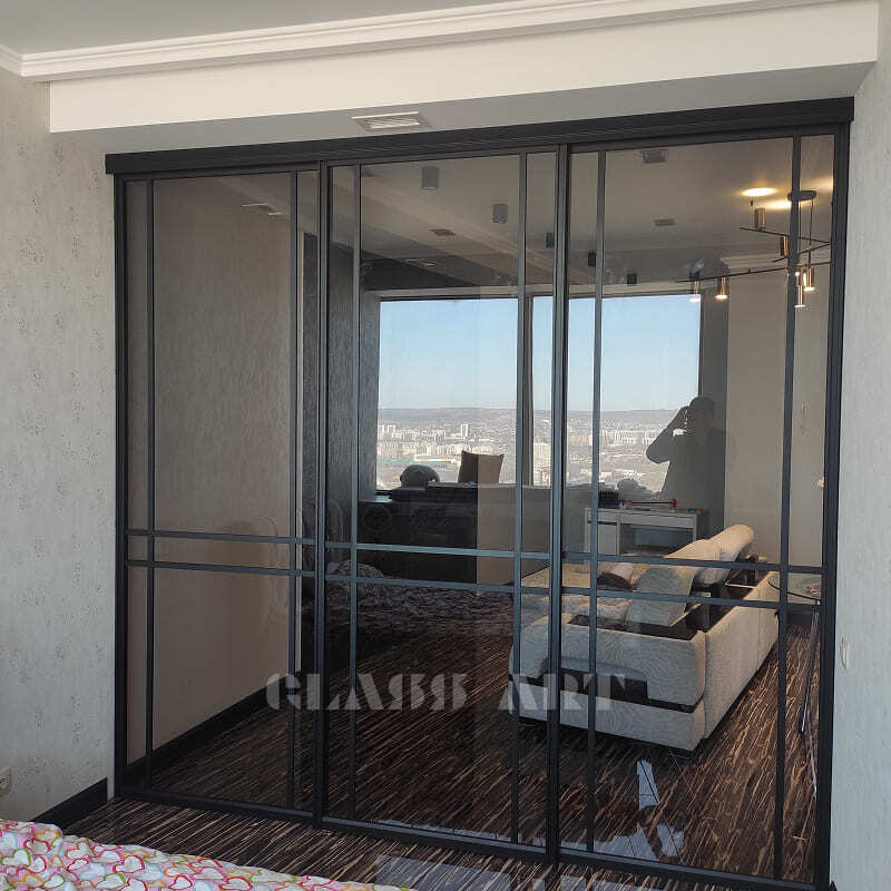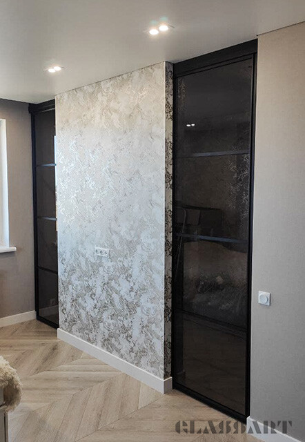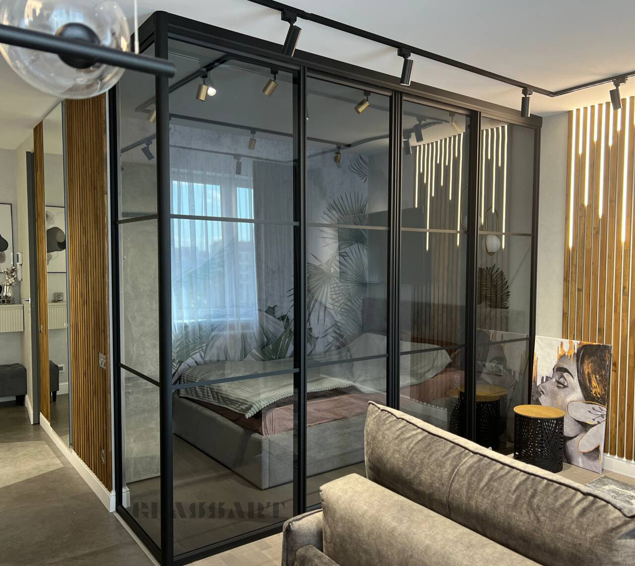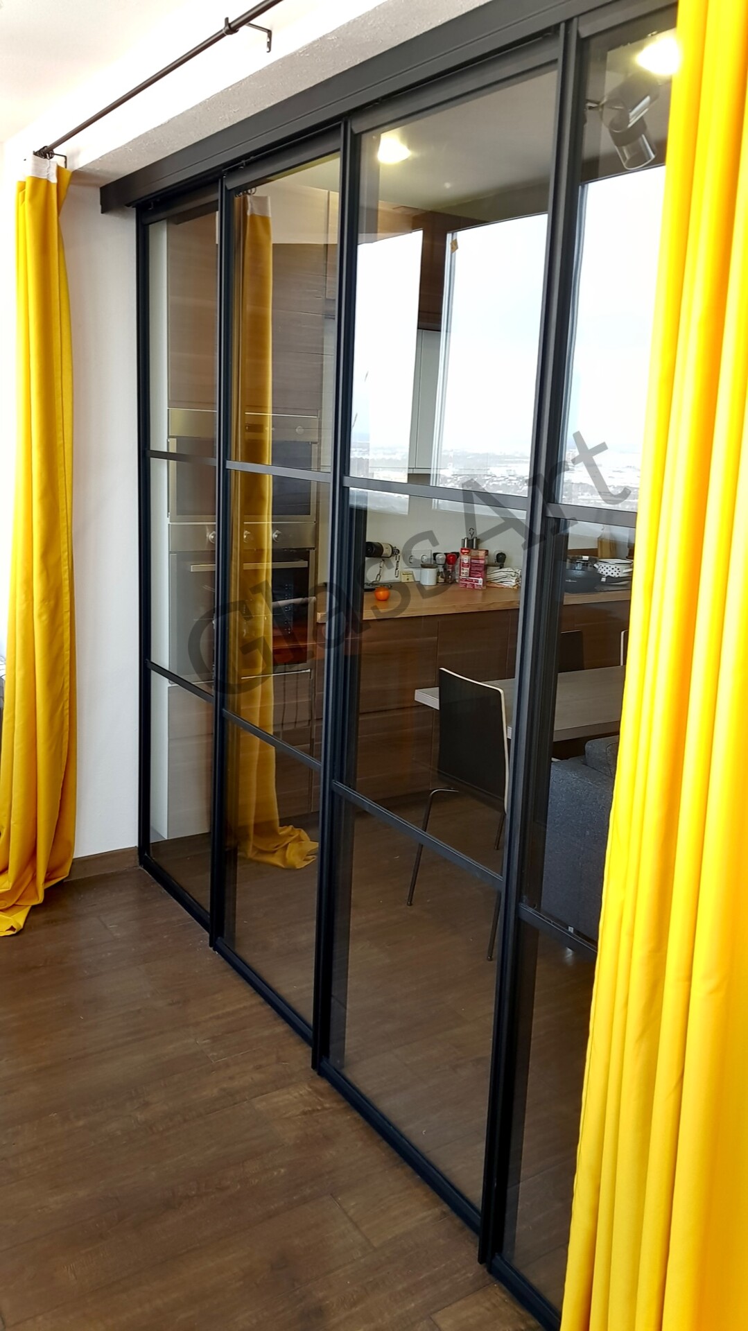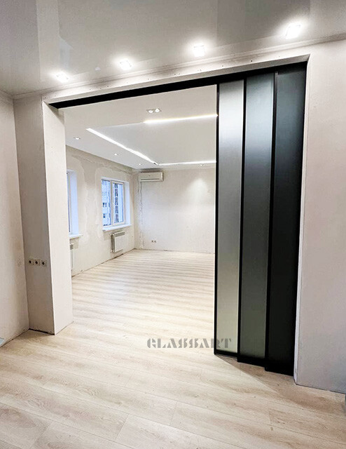 Раздвижная перегородка в стиле лофт с синхронным открыванием двери.