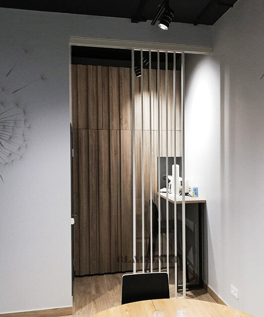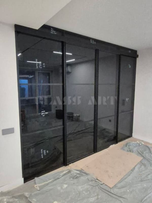 Раздвижная перегородка с каскадным открыванием дверей. Выполнена на раздвижной системе с верхним треком.