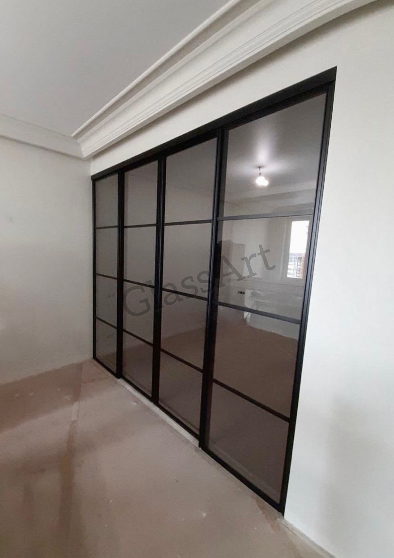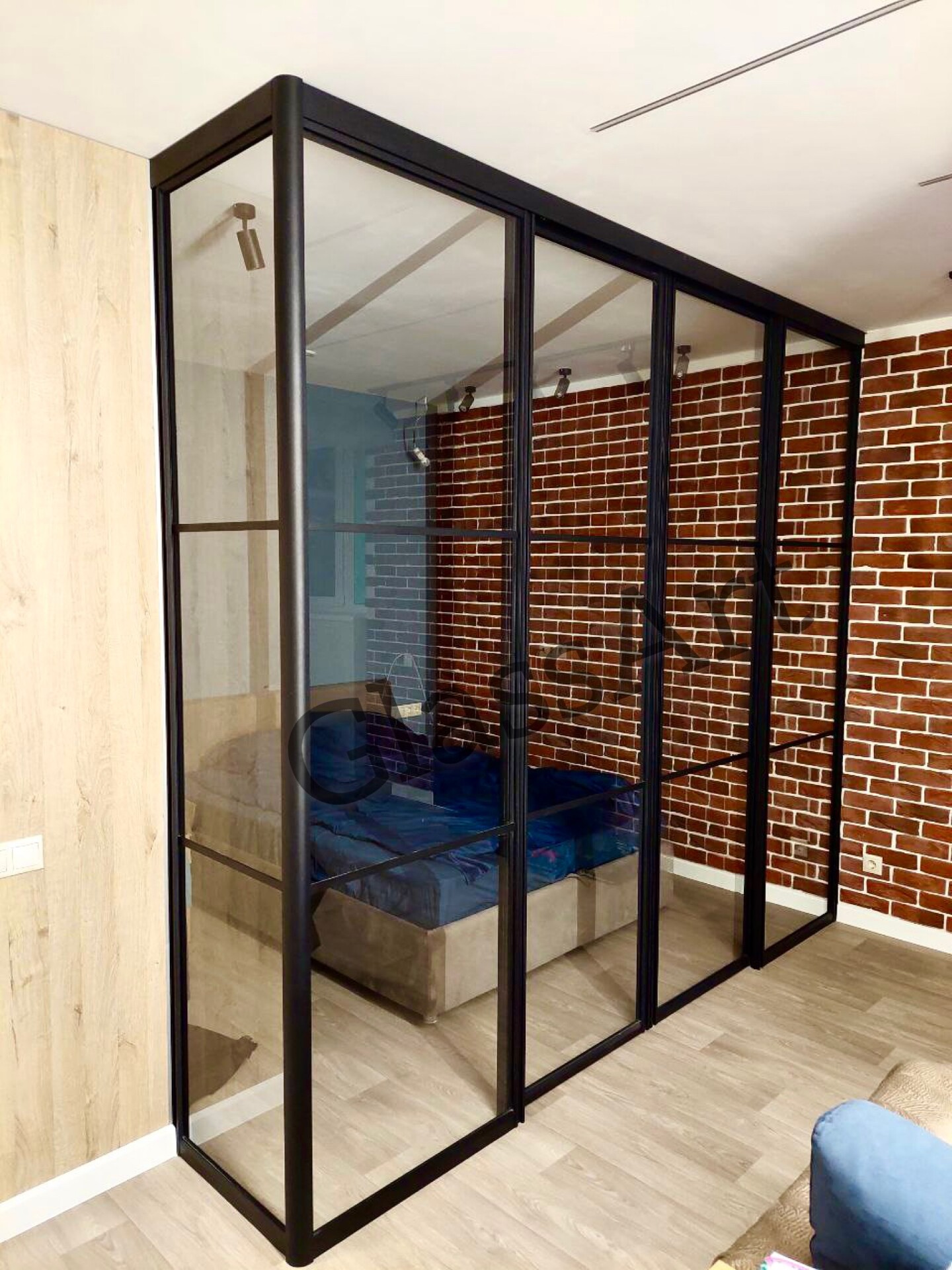 Перегородка в стиле лофт с синхронным открыванием дверей выполнена:
