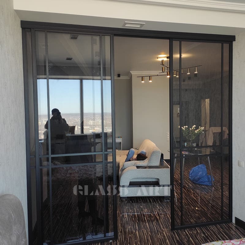 Лофт перегородка на балкон раздвижная, с каскадным открыванием дверей