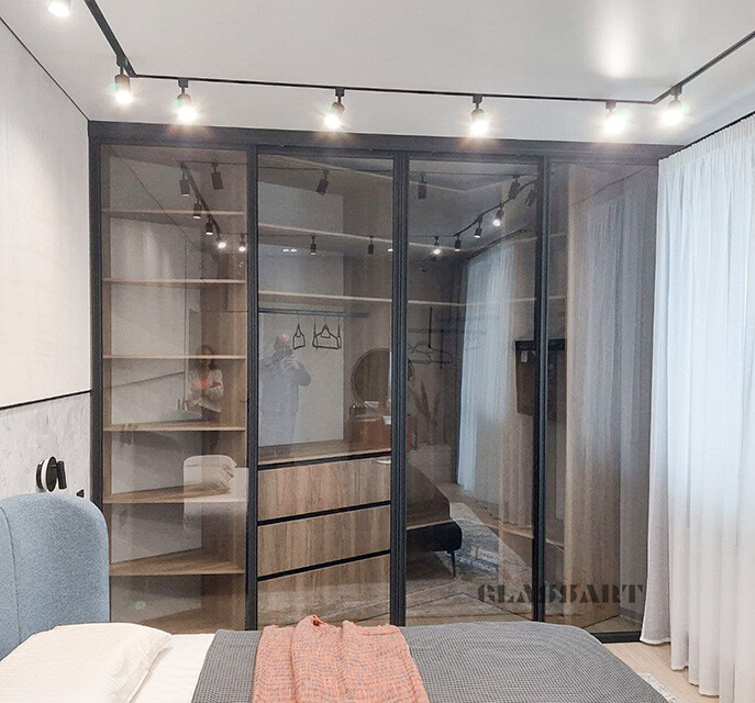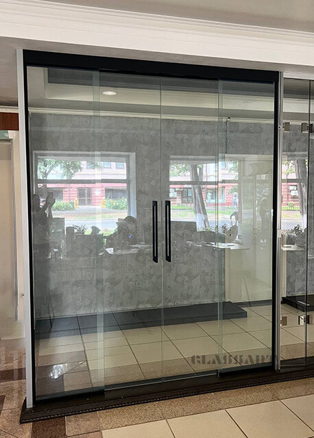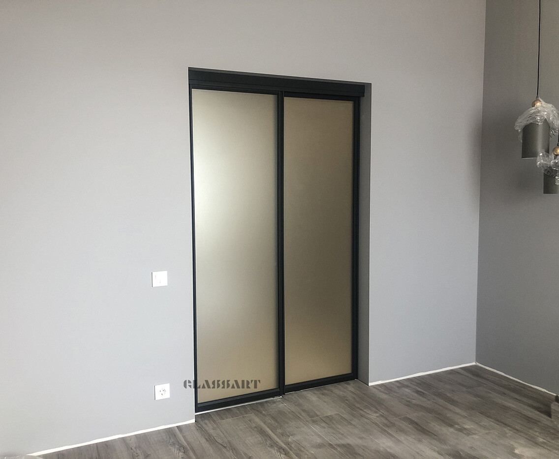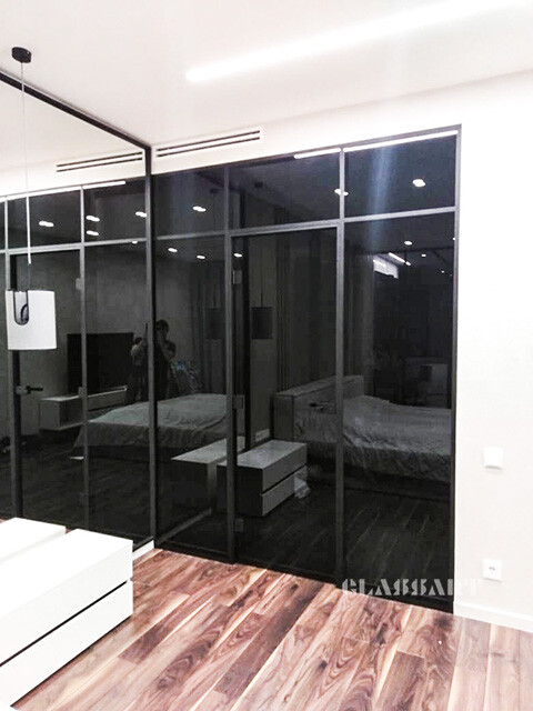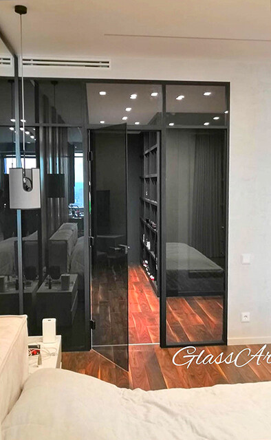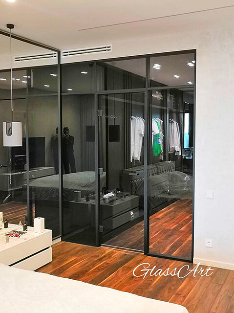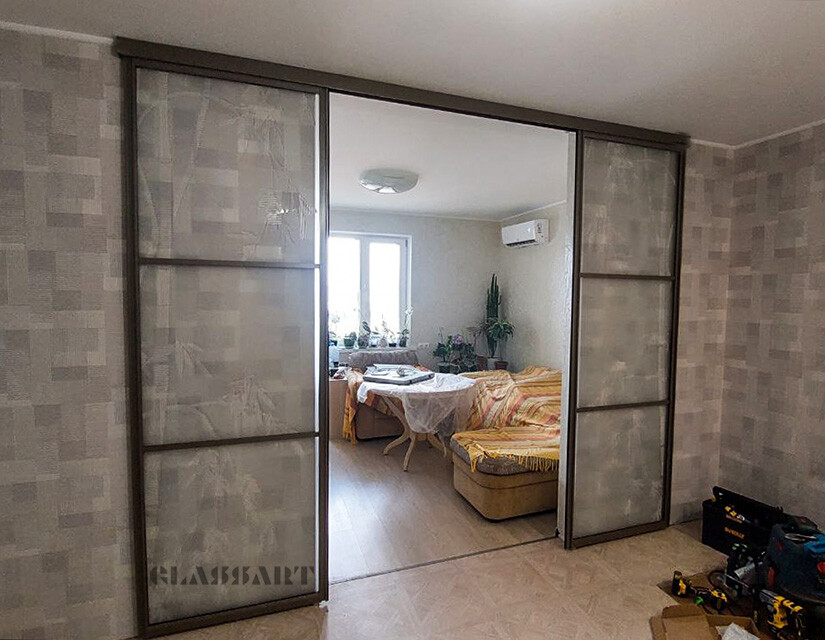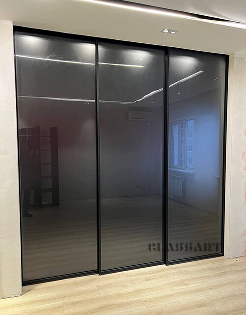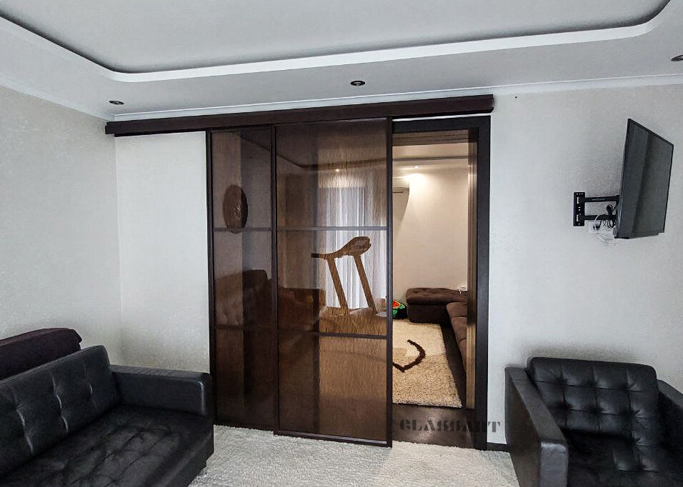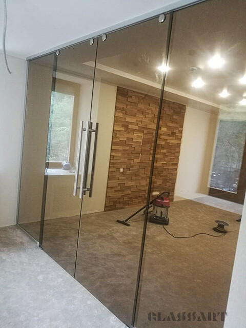 Перегородка раздвижная с синхронным открыванием дверей. Из ударопрочного закаленного тонированного стекла Planibel Grey толщиной 4 мм. Алюминиевый профиль профиль Bravo traversa 35*40, его форма служит удобной ручкой.