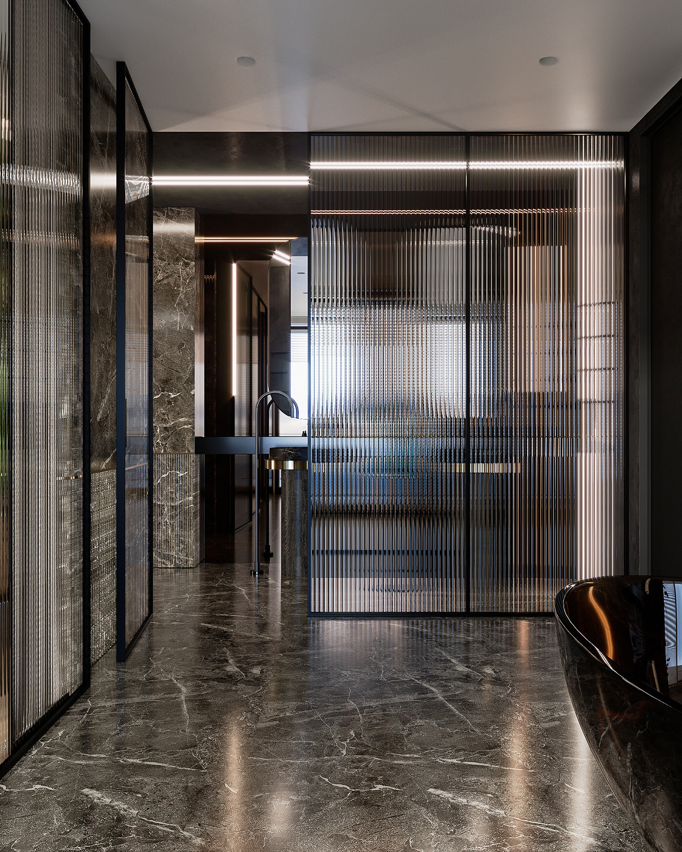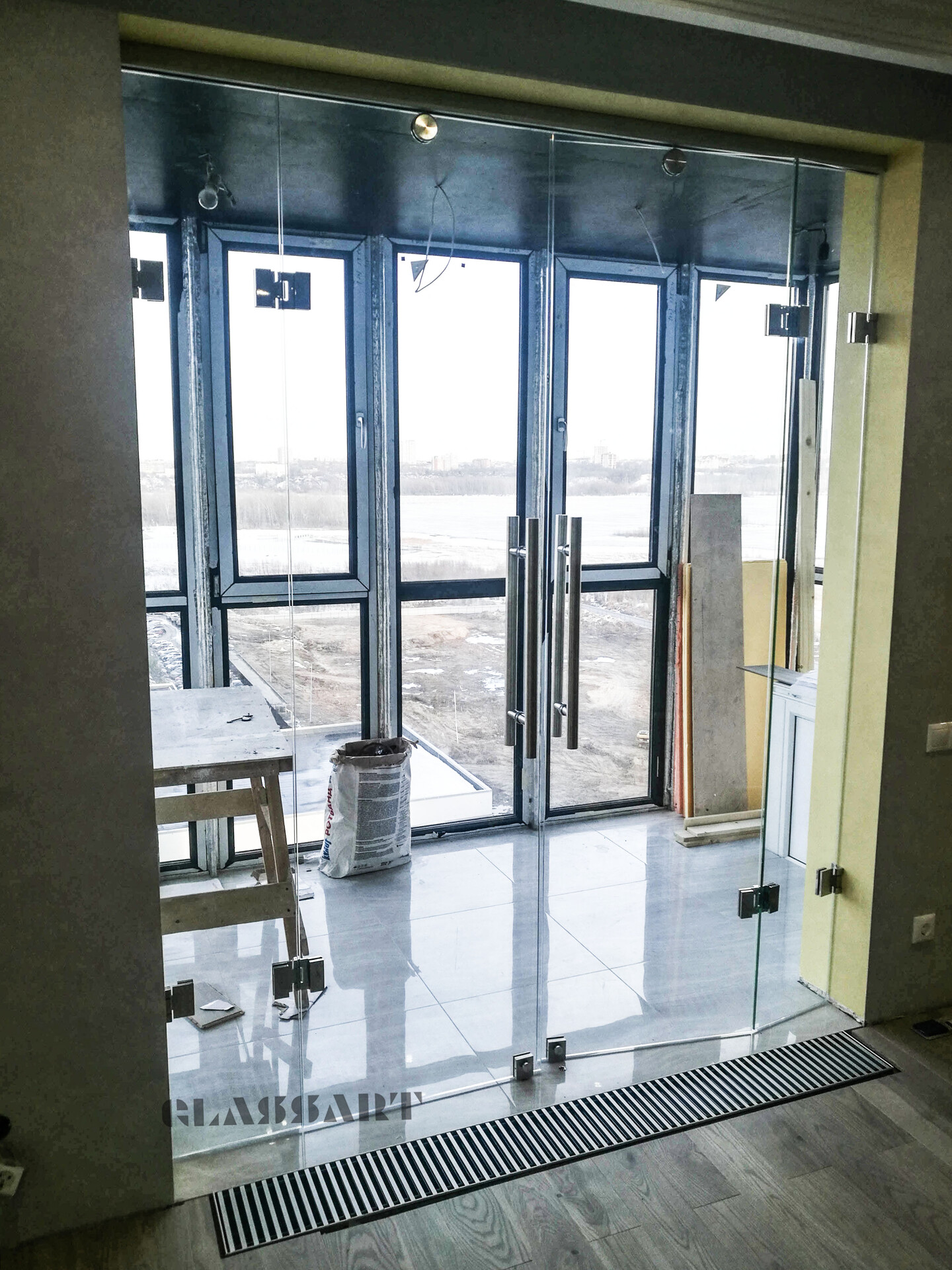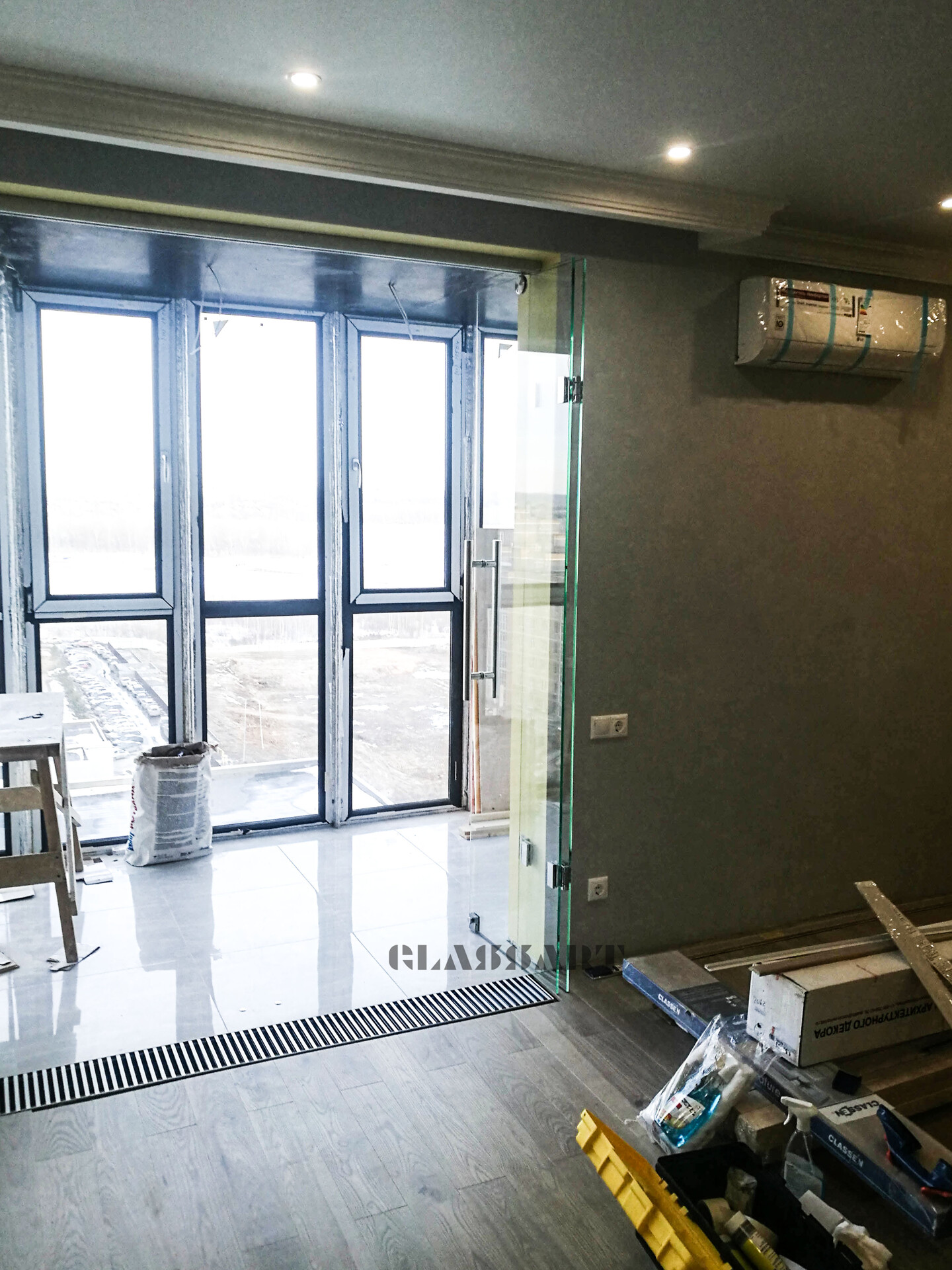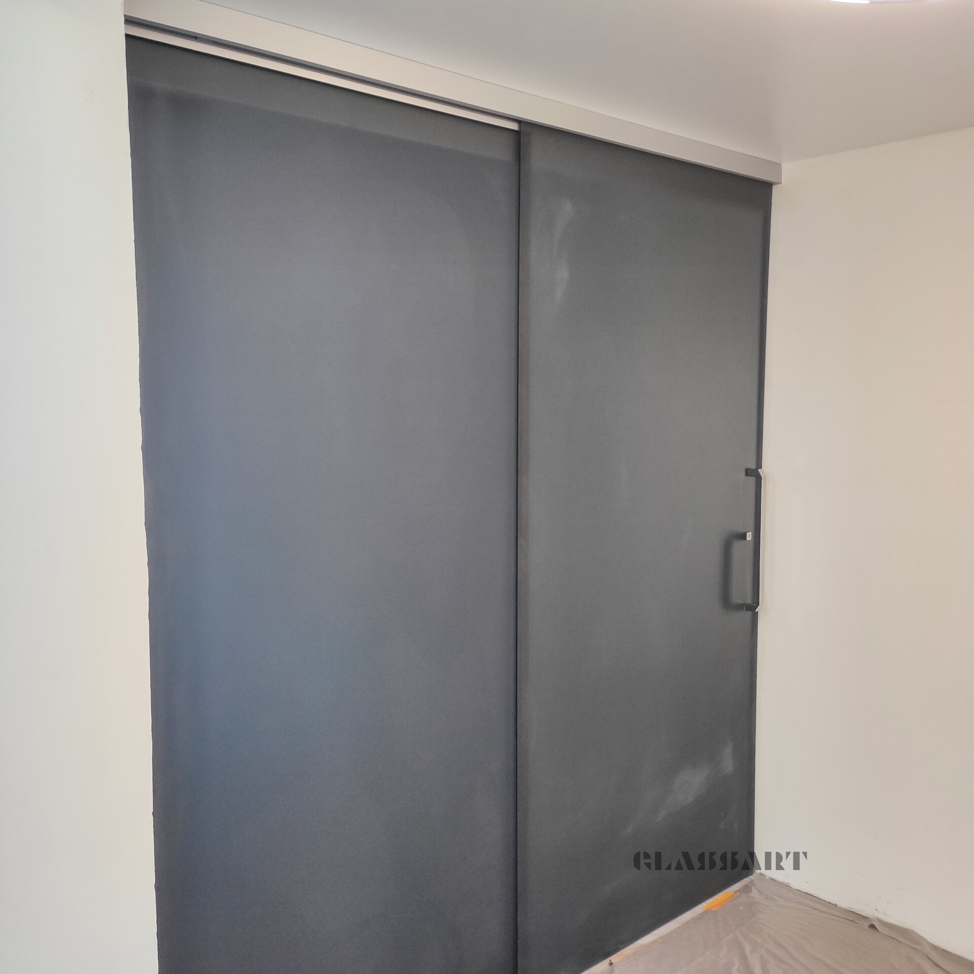 Перегородка раздвижная с синхронным открыванием дверей. Из ударопрочного закаленного тонированного стекла Planibel Grey толщиной 4 мм. Алюминиевый профиль профиль Bravo traversa 35*40, его форма служит удобной ручкой.