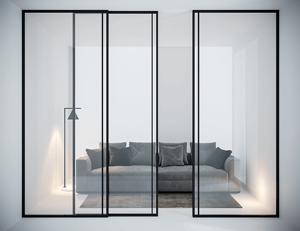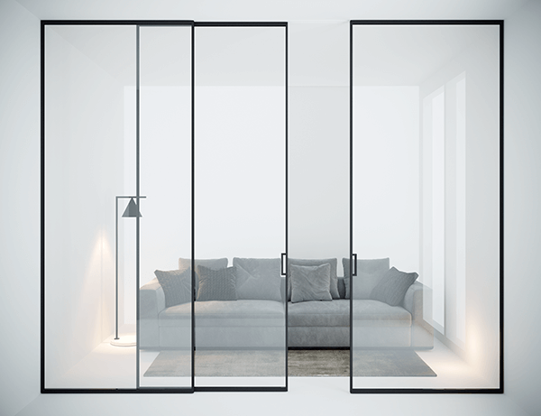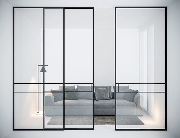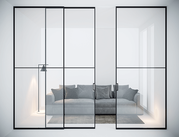 Раздвижные двери в стиле лофт выполнены на беспороговой раздвижной системе Росла (Rosla).