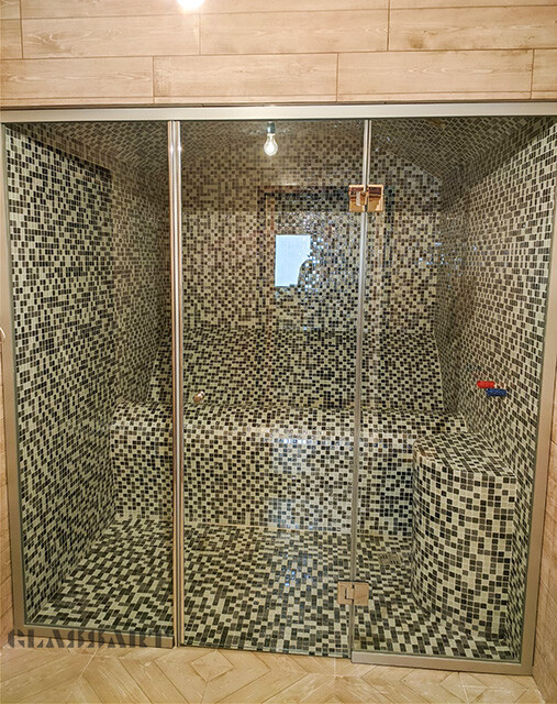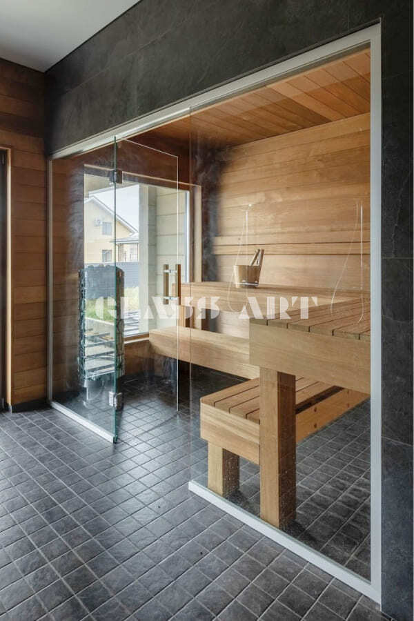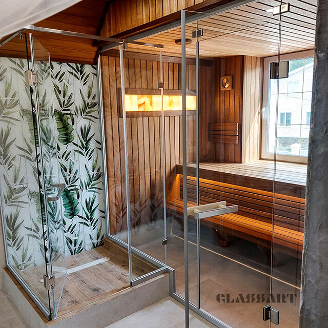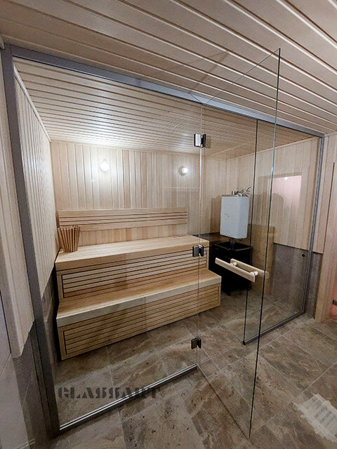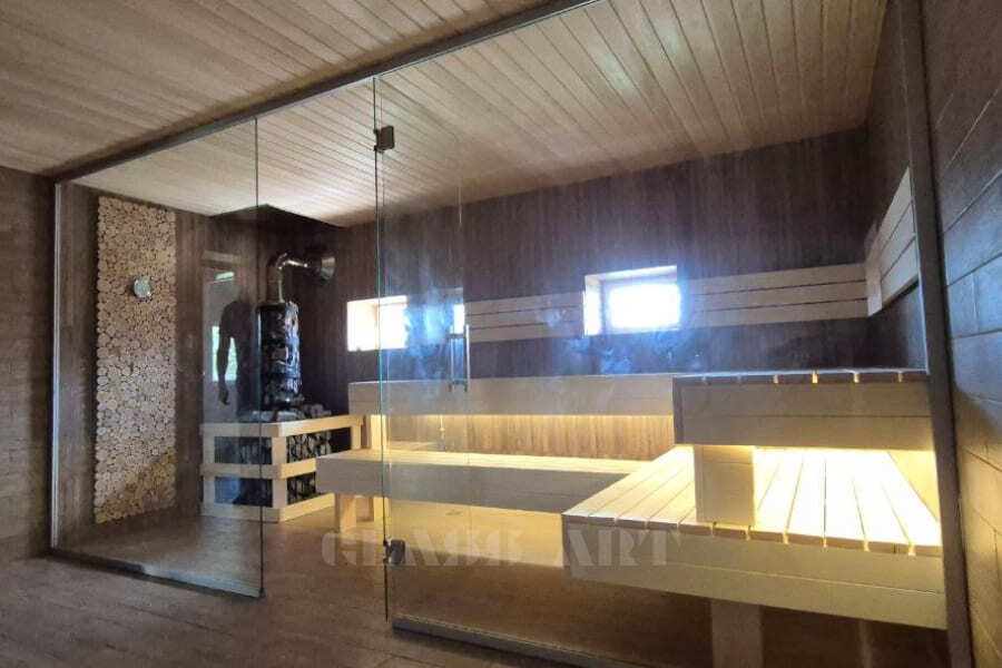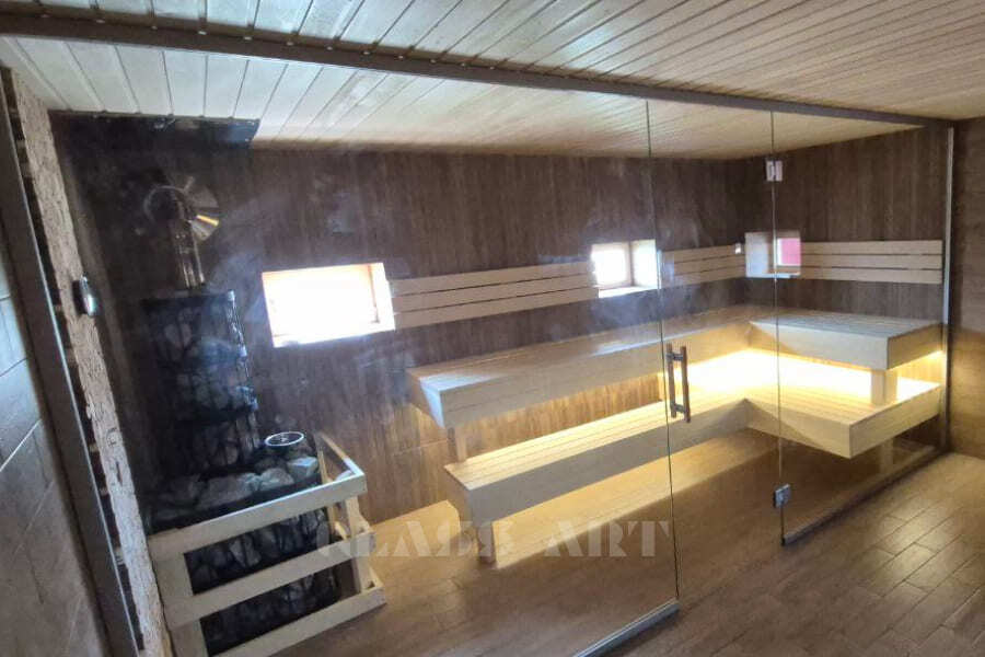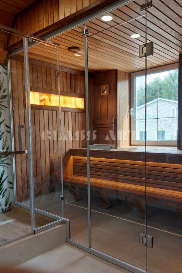 Закаленное стекло сохраняет свои свойства при температуре до 760 ºС, поэтому оптимально для использования в парных.