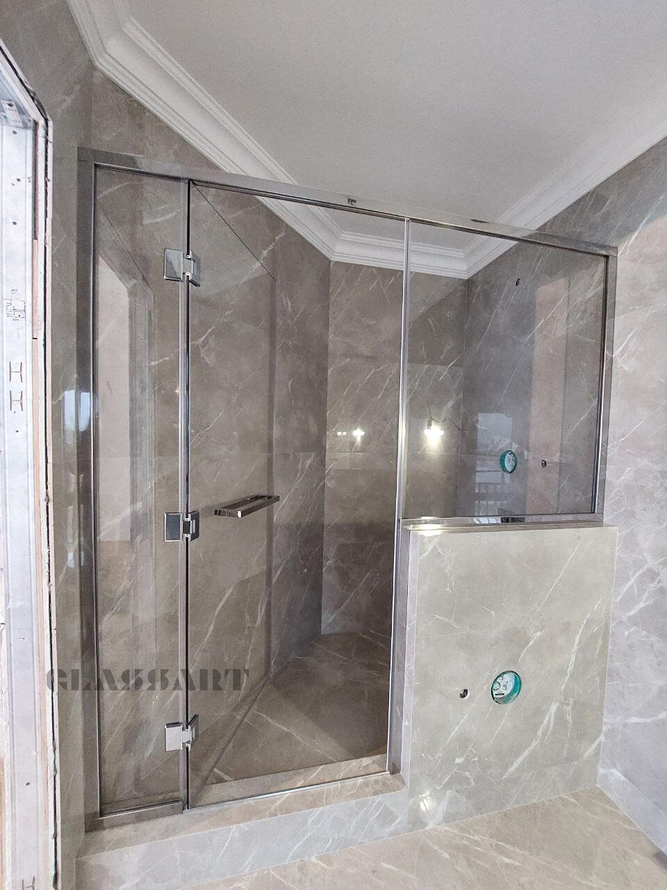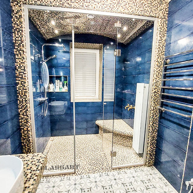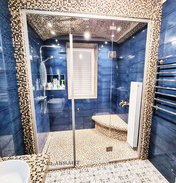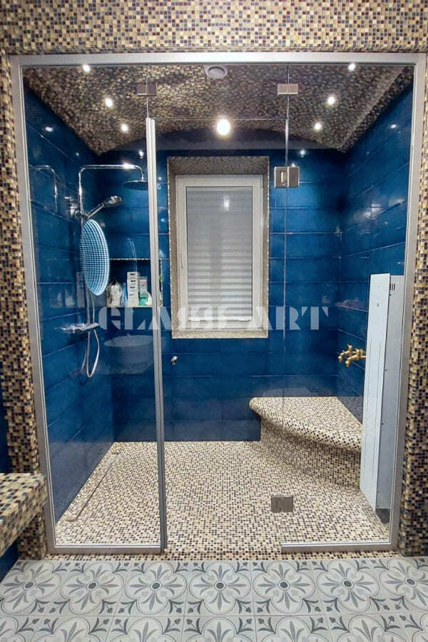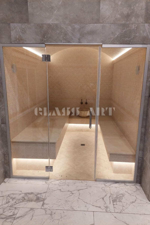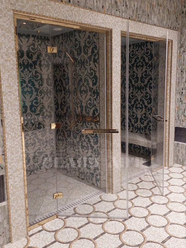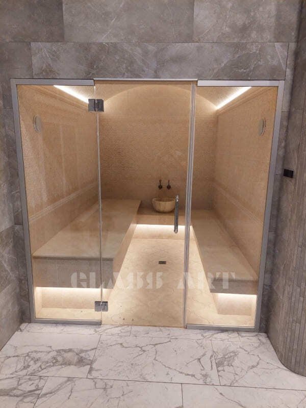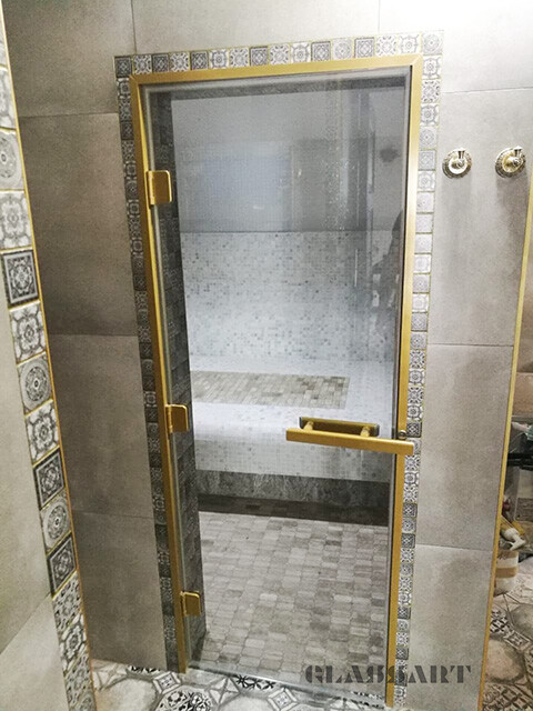 В хамам можно использовать ручки из алюминия, металла, под стекло, комбинированные - более декоративные, так как температура не высокая, и можно рассмотреть больше вариантов.